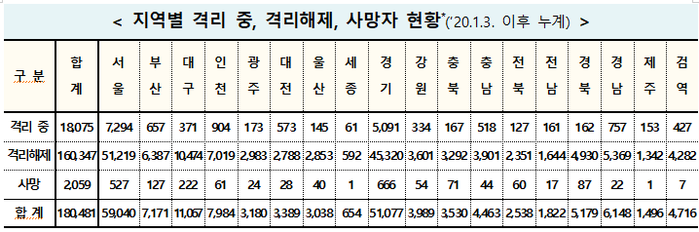 ▲ 20일 0시 기준 코로나19 지역별 격리 및 사망자 현황. [출처=중앙방역대책본부] |