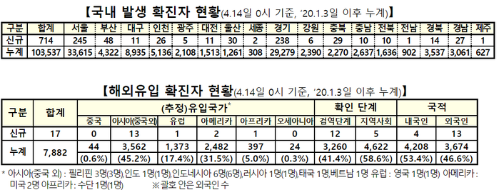 ▲ 14일 0시 기준 코로나19 국내발생 및 해외유입 확진자 현황. [출처= 중앙방역대책본부] |