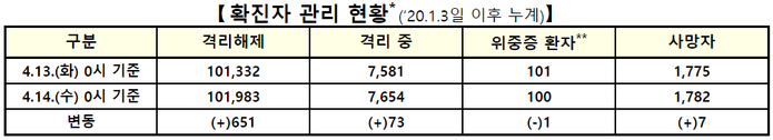 ▲ 14일 0시 기준 코로나19 확진자 관리 현황. [출처= 중앙방역대책본부] |