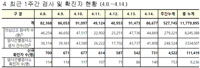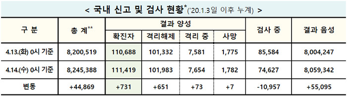 중앙방역대책본부(방대본)는 14일 0시 기준으로 코로나19 신규 확진자가 731명 추가 발생해 지금까지 누적 확진자 수가 11만1419명으로 집계됐다고 밝혔다. 이중 해외유입 누적 확진자는 7882명이다.