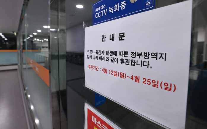 ▲ 13일 서울 광진구의 한 스포츠센터에 코로나19 확진자 발생으로 인한 휴관 안내문이 부착돼 있다. [서울= 연합뉴스] |
