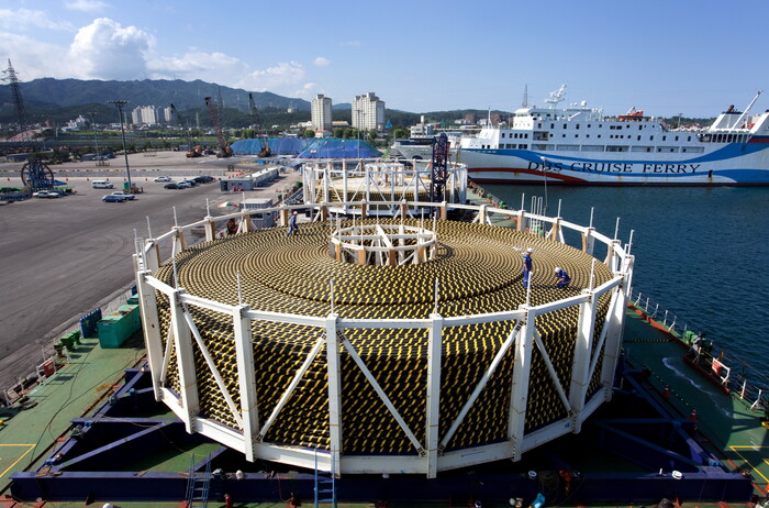 | ▲ LS전선이 동해시 사업장 인근 동해항에서 해저케이블을 선적하고 있다 [사진=LS전선 제공] |
