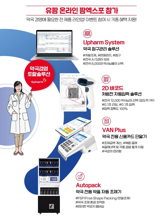 이외에도 ▲바코드 리더기를 통한 처방전 자동 입력 솔루션 ‘유팜 2D바코드’ ▲바코드 리더로 일반의약품과 조제의약품의 비용을 합산·결제할 수 있는 약국 전용 카드 단말기 ‘VAN plus’ ▲약국 시스템과 연동해 자동으로 약을 조제·포장하는 ‘오토팩’도 출품한다.