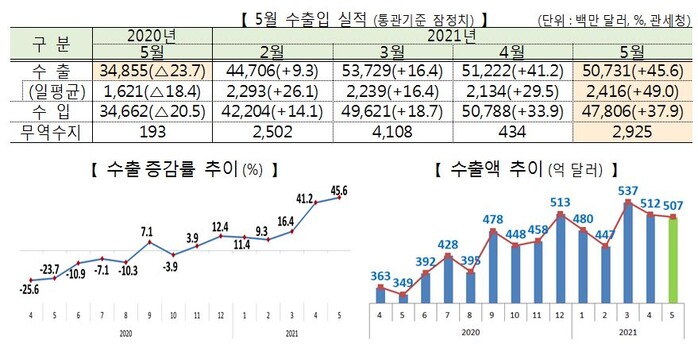 1일 산업통상자원부에 따르면, 우리나라 5월 수출액은 전년 동기 대비 45.6% 증가한 507억 3000만 달러를 기록했다. 무역수지는 29억 3000만 달러로 13개월 연속 흑자를 유지했다.
