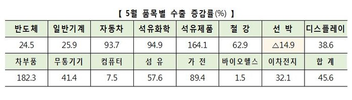 석유화학은 45억 7000만 달러로 94.9% 늘었다. 이는 지난 3월과 4월에 이어 역대 3위 수출 실적이다. 석유제품도 164.1% 늘어 15년 만에 최대 증가율을 기록했다.