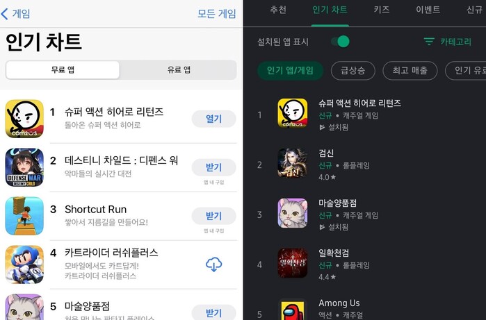 ▲ 인기차트 순위(왼쪽: 애플 앱스토어, 오른쪽: 구글 플레이스토어) [사진=컴투스 제공] |