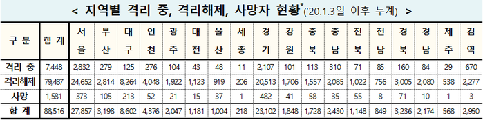 전날 하루 437명이 추가 완치돼 누적 격리해제자는 7만9487명이 됐다. 완치율은 89.80%를 보였다. 격리치료 중인 환자는 전날보다 46명 감소해 총 7448명으로 집계됐다.