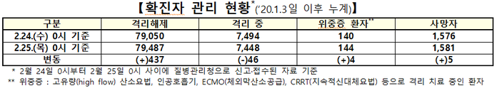 ▲ 25일 0시 기준 전날 대비 코로나19 확진자 관리 현황. [출처=중앙방역대책본부] |