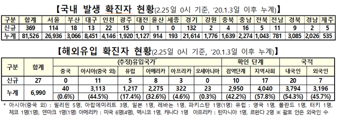 ▲ 25일 0시 기준 전날 대비 코로나19 국내발생 및 해외유입 확진자 현황. [출처=중앙방역대책본부] |