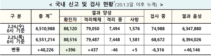 ▲ 25일 0시 기준 전날 대비 코로나19 국내신고 및 검사 현황. [출처=중앙방역대책본부] |