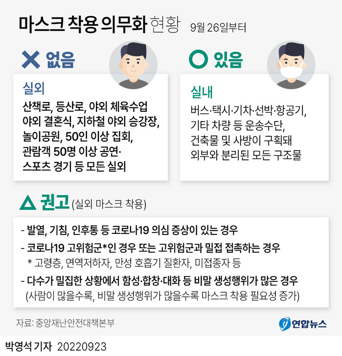 ▲ 오는 26일부터 실외에서 마스크 착용 의무가 전면 해제된다. 이에 따라 이날부터는 50인 이상이 모이는 야외 집회에 참석할 때나 공연, 스포츠 경기를 관람할 때도 마스크를 쓰지 않아도 된다. [그래픽=연합뉴스] |