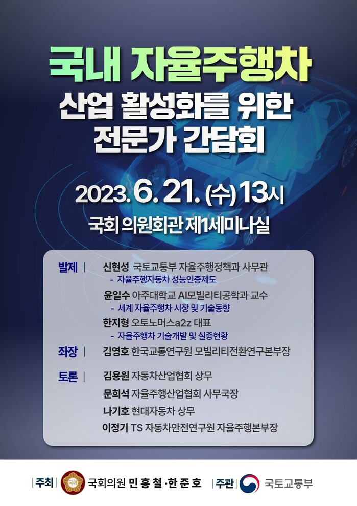 이번 간담회를 공동주최한 한준호 의원은 “대한민국 전체의 부단한 노력으로 자리잡은 자동차 강국의 지위를 확실히 다지기 위해 자율주행차 산업 활성화는 반드시 필요한 국가적 과제”라면서 “이번 간담회가 국내 자율주행차 서비스의 확산과 산업생태계의 활성화를 이루는 초석이 되기를 기원한다”고 전했다.