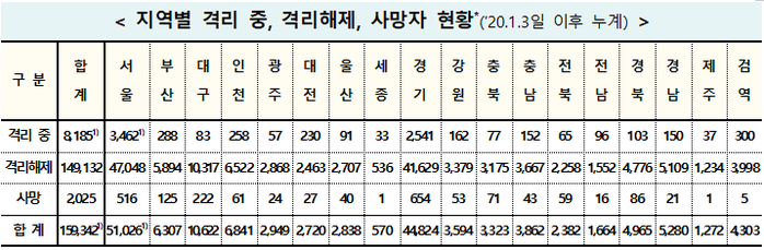 ▲ 3일 0시 기준 코로나19 지역별 격리 및 사망자 현황. [출처=중앙방역대책본부] |