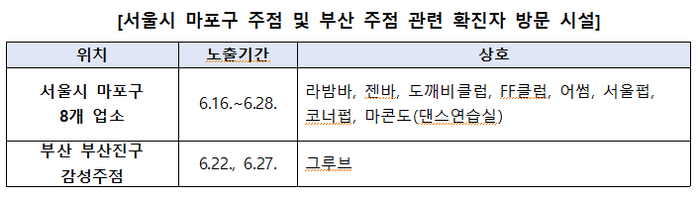 ▲ 서울시 마포구 주점 치 부산 주점 관련 확진자 방문 시설. [출처=중앙방역대책본부] |