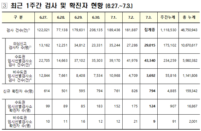 중앙방역대책본부는 3일 0시 기준으로 국내 코로나19 신규 확진자가 794명 새롭게 확진돼 지금까지 누적 확진자는 총 15만9342명(해외유입 1만74명)으로 집계됐다고 밝혔다.