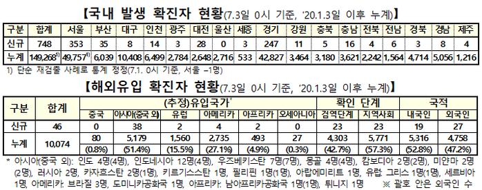 해외유입 확진자 46명 중 23명은 압국 검역단계에서 확인됐고, 나머지 23명(서울 6명, 경기 5명, 부산 4명, 인천·경남 각 2명, 울산·충북·전남·경북 각 1명)은 지역사회에서 자가격리 중 확진됐다. 국적별로는 내국인 19명, 외국인 27명이다.