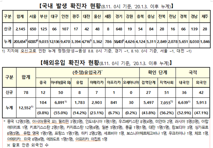 ▲ 11일 0시 기준 코로나19 국내발생(지역발생) 및 해외유입 확진자 현황. [출처=중앙방역대책본부] |