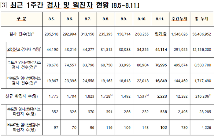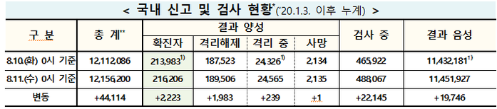 중앙방역대책본부는 11일 0시 기준 코로나19 신규 확진자가 2223명 발생해 지금까지 누적 확진자가 21만6206명(해외유입 1만2552명)으로 집계됐다고 밝혔다.