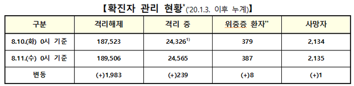 ▲ 11일 0시 기준 코로나19 격리 및 사망자 현황. [출처=중앙방역대책본부] |