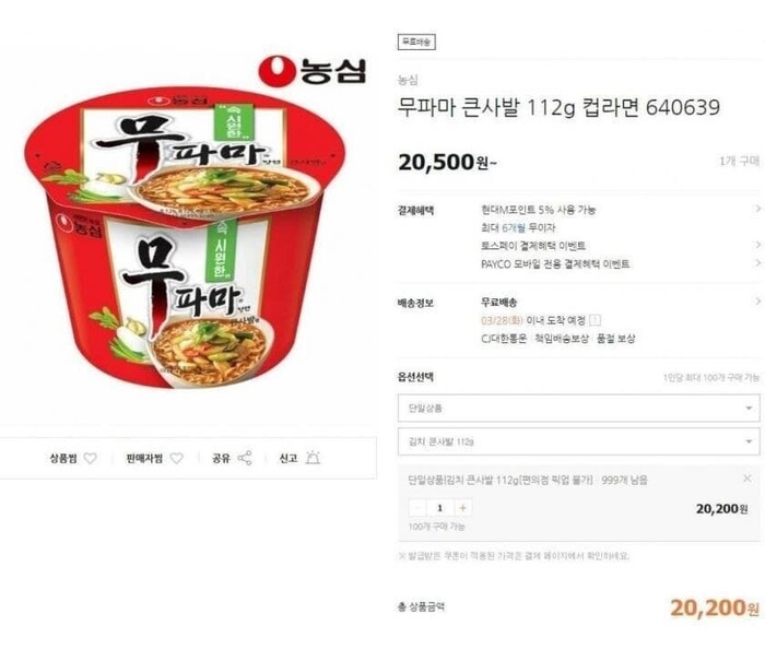 캡처 사진 속 제품은 ‘농심 무파마 큰사발 112g 컵라면’이라는 상품명과 2만 500원이라는 가격이 적혀 있었다. 실제 구매가는 2만 200원으로 표기돼 있다.