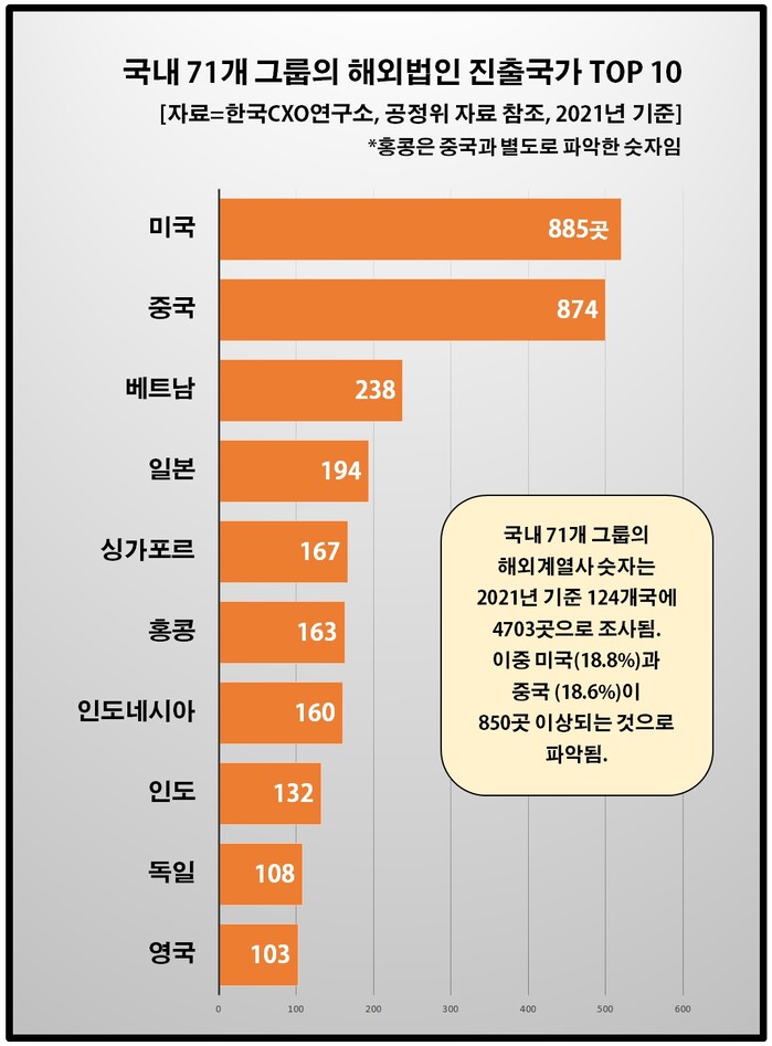 국가별로는 미국(885)이 전체 비중의 18.8%를 차지하며 국내 그룹이 가장 많은 법인을 세운 나라로 집계됐다. 이 중 삼성·현대차·SK·LG 등 4대 그룹이 운영하는 법인 수는 총 268곳으로 71개 그룹 가운데 30%를 넘었다.