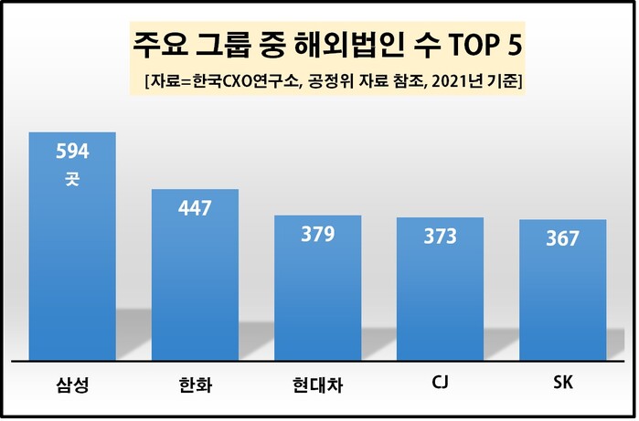 조사 대상 중 해외법인이 가장 많은 그룹은 삼성(594)으로, 한화(447), 현대차(379), CJ(373), SK(367), LG(360), 롯데(220) 등이 그 뒤를 따랐다.