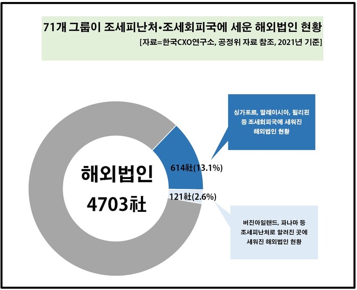 국내 71개 기업집단(그룹)이 운영하는 해외법인 가운데 조세회피처로 의심되는 곳이 15.7%에 달하는 것으로 나타났다.