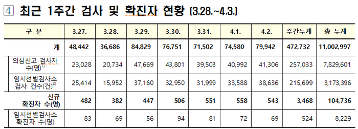 ▲ 3일 0시 기준 코로나19 국내 신고 및 검사 현황. [출처= 중앙방역대책본부] |