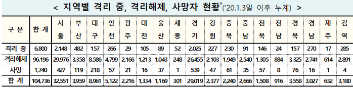 ▲ 3일 0시 기준 코로나19 지역별 격리 및 사망자 현황. [출처= 중앙방역대책본부] |