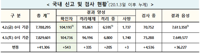중앙방역대책본부(방대본)는 3일 0시 기준으로 국내 신규 확진자가 543명 새롭게 발생해 지금까지 누적 확진자 수는 10만4736명(해외유입 7650명)으로 집계됐다고 밝혔다.