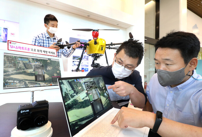| ▲ LG유플러스 관계자들이 U+스마트드론의 화재 감지 서비스를 점검하는 모습 [사진=LG유플러스 제공] |
