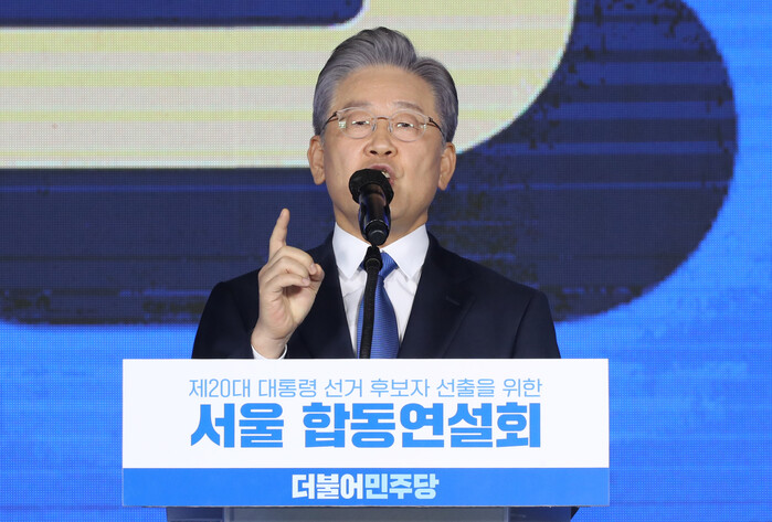 ▲ 더불어민주당 제20대 대통령 후보에 선출된 이재명 경기도지사가 10일 오후 서울 송파구 올림픽공원 SK올림픽핸드볼경기장에서 열린 서울 합동연설회에서 수락연설을 하고 있다. [국회사진기자단=연합뉴스] |