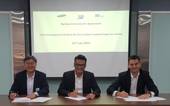 ▲ 지난해 7월 윤종현 삼성중공업 조선시추설계담당(사진 왼쪽)이 탄소 제로 암모니아 추진선 개발을 위해 MISC, 로이드선급과 JDP를 체결하고 있는 모습 [사진= 삼성중공업] |