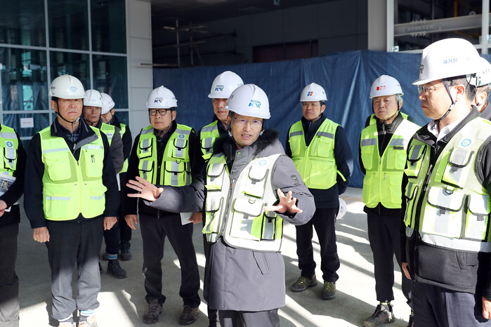 | ▲국가철도공단 김한영 이사장(앞줄 가운데)이 지난 3일 동두천~연천 철도사업 연천역 건축공사 현장을 찾아 사업진행 상황을 점검하고 있다. |