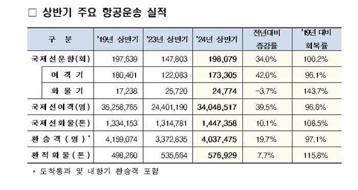 국제선 운항은 2024년 상반기에 19만 8,079회를 기록하며 지난해 동기(14만 7,803회) 대비 34.0% 증가하였으며, 2019년 상반기(19만 7,639회)를 넘는 운항을 기록했다. 이는 여객기 운항이 96.1% 회복한 것과 더불어 코로나 시기 높아진 화물기 운항이 지속되며 코로나 이전 대비 43.7% 증가한 것에 기인하고 있다.