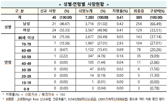 전날보다 9명이 많은 45명이 더 목숨을 잃으면서 누적 사망자는 7283명이 됐다. 누적 치명률은 0.41%이다.