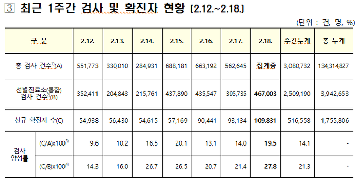 중앙방역대책본부(방대본)는 18일 0시 기준으로 코로나19 확진자가 전날 대비 10만9831명 새롭게 확인돼 누적 175만5806명(해외유입 누적 2만7864명)으로 늘었다고 밝혔다.