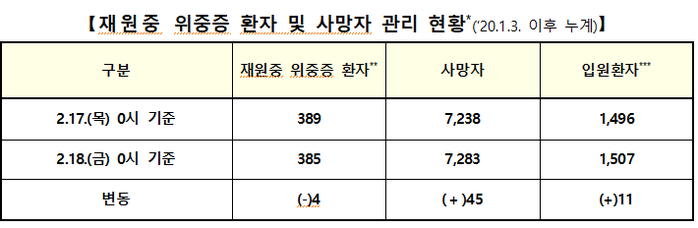 ▲ 18일 0시 기준 코로나19 위중증 환자 및 사망자 관리 현황. [중앙방역대책본부 제공] |