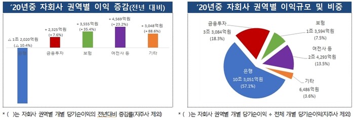 은행이 대손충당금 확대와 사모펀드 관련 비용 등으로 1조 2020억원(△10.4%) 감소했다. 반면 금융투자는 증시활황에 따른 수수료수익 증가 등으로 2325억원 (+7.6%) 늘었고, 보험도 3555억원(+35.4%), 여전사 등도 4569억원(+23.2%) 증가했다.