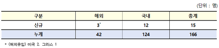 오미크론 변이 감염자는 15명이 추가돼 누적 166명이 됐다. 해외유입 3명(미국2, 그리스1)에 국내감염 12명이다.