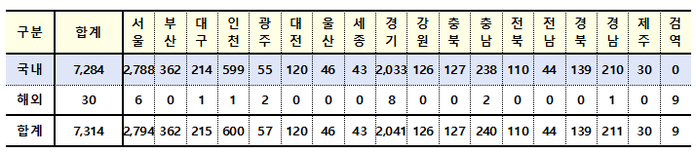 전날 전체 신규 확진자 중 국내감염(지역발생)은 7284명이고 해외유입은 30명이다. 해외유입은 전날보다 5명이 적다.