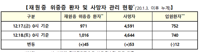 ▲ 18일 0시 기준 코로나19 위중증 환자 및 사망자 관리 현황. [중앙방역대책본부 제공] |