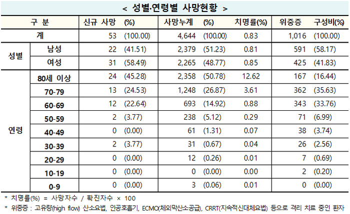 전날 코로나19로 목숨을 잃은 환자도 53명에 이른다. 이로써 국내 코로나19 누적 사망자 수는 4644명으로 늘었다. 평균 치명률은 0.83%를 기록했다.