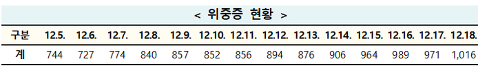 이날 수치에서 가장 주목되는 부분은 위중증 환자 수다. 1016명으로 전날보다 45명 증가했다. 특히 지난해 1월 20일 국내에서 첫 환자가 발생한 이후 역대 최초로 1천명 선을 넘었다.
