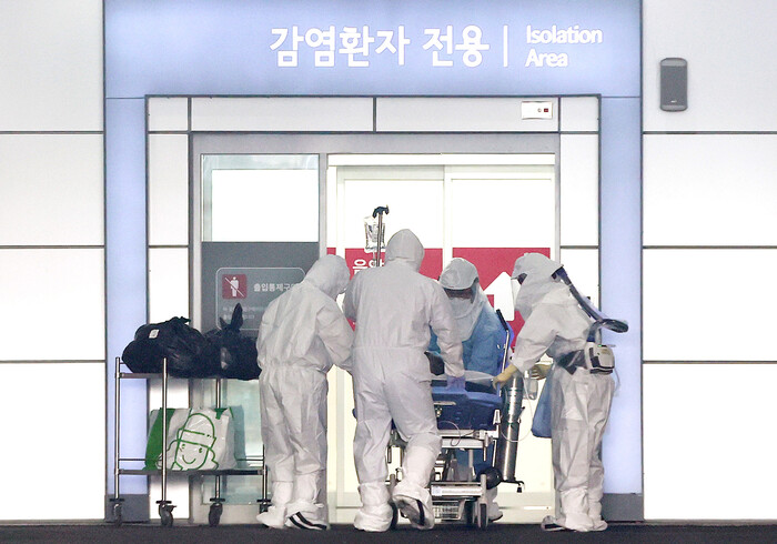 ▲ 지난 16일 오전 코로나19 치료 전담 병원인 서울 중랑구 서울의료원에서 의료진이 확진자를 이송하고 있다. [사진=연합뉴스] |
