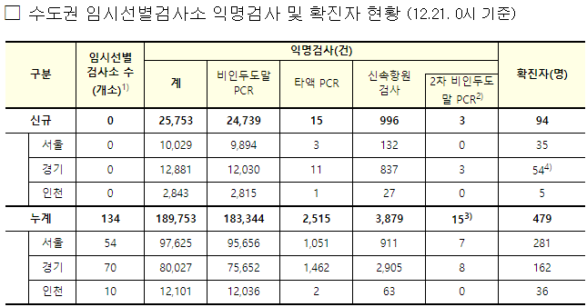 전날 하루 이뤄진 익명 검사 건수는 2만5753건이며, 이중 94명에게서 양성판정이 나왔다. 서울 35명, 경기 54명, 인천 5명이었다.