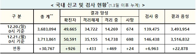 질병관리청 중앙방역대책본부(방대본)는 21일 0시 기준으로 전날 대비 코로나19 신규 확진자가 926명이 추가돼 지금까지 누적 확진자 수는 5만591명(해외유입 5116명)이라고 밝혔다.