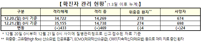 ▲ 21일 0시 기준 코로나19 확진자 관리 현황. [출처= 중앙방역대책본부] |
