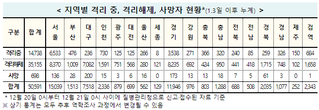 ▲ 21일 0시 기준 코로나19 격리해제 및 사망자 현황. [출처= 중앙방역대책본부] |