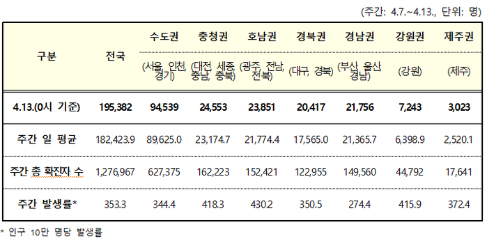 ▲ 주간 일평균 지역별 확진자수 현황. [중앙방역대책본부 제공]